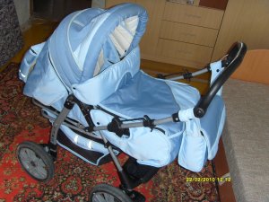 Продам коляску трансформер производства Польша. Три положения спинки, два положения ручки, регулируемая высота ручки. Большие колеса амортизированы, сумка для переноса ребенка, дождевик. Отличное состояние.